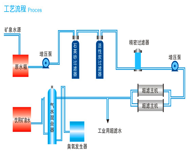 原水箱→原水增壓泵→機械過濾器→活性炭過濾器→5μm精濾→超濾主機→凈水箱→灌裝→成品