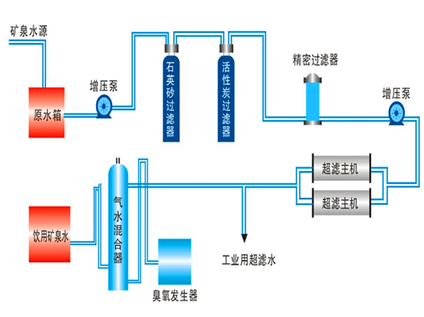 原水箱→原水增壓泵→機械過濾器→活性炭過濾器→1μm精濾→超濾主機→臭氧消毒→凈水箱→灌裝→成品