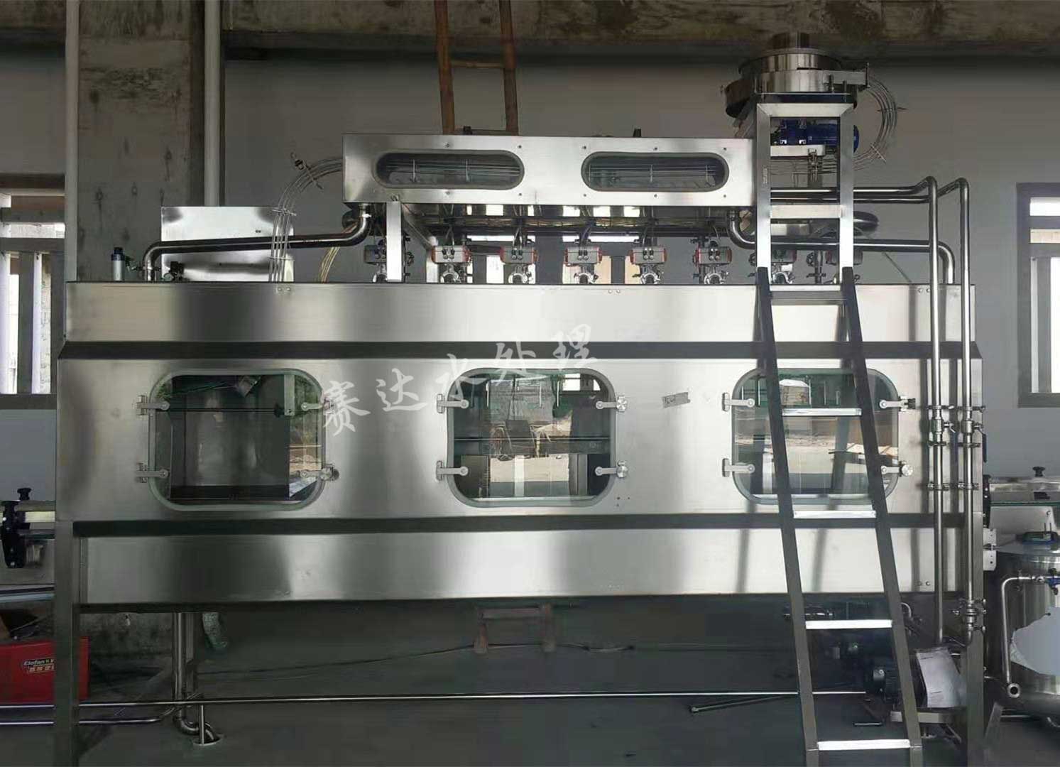 桶裝水灌裝機集消毒、沖洗、灌裝、封蓋于一體,其沖洗工位包括:熱堿液噴洗、、消毒液噴洗、道回用水噴洗、成品水噴洗、滴干等工位,具體根據用戶要求,做6-20個不同的沖洗工位。
